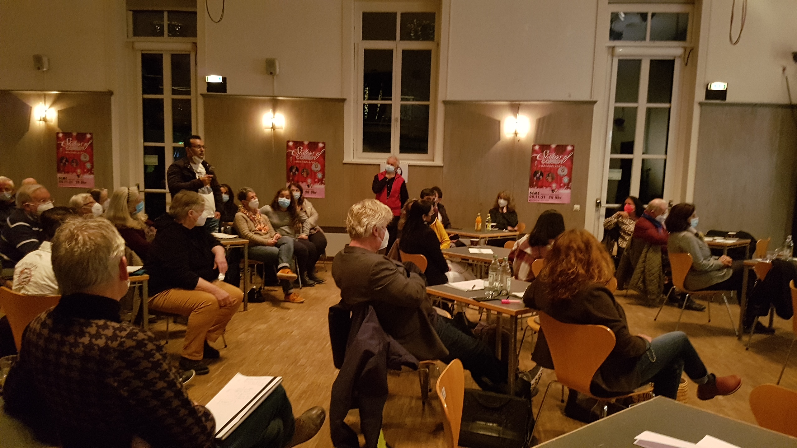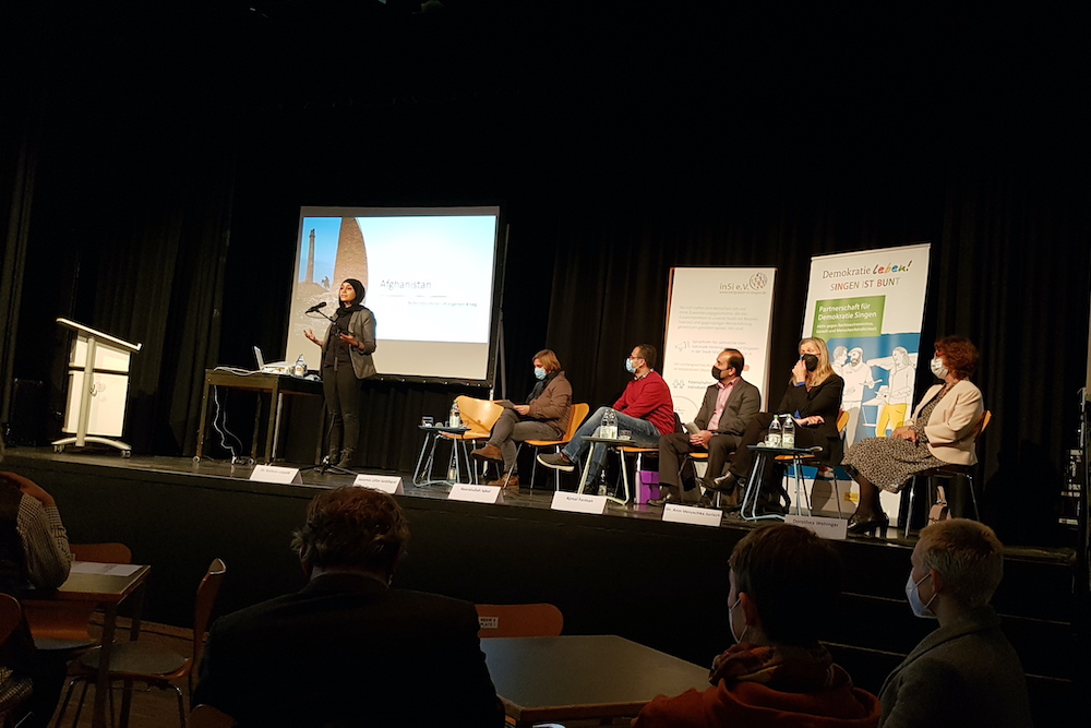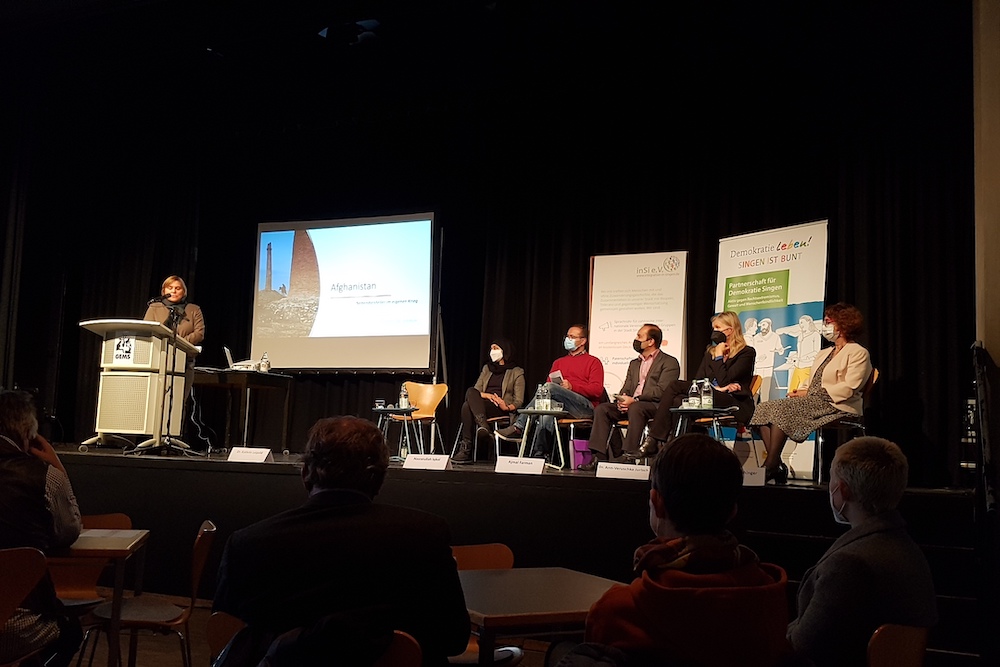 An der Veranstaltung in der Gems nahmen 80 Besucher:innen teil, die im Anschluss an die Fachbeiträge die Gelegenheit hatten sich mit Fragen und Anregungen an die Podiumsgäste zu wenden. Es wurde u. a. angeregt, das Netzwerk der in Deutschland lebenden Afghan:innen zu stärken. Darüber hinaus wurde diskutiert inwieweit auch unter dem Regime der Taliban momentan Hilfe vor Ort in Afghanistan geleistet werden kann und ob die Möglichkeit besteht, Familienangehörige und Freund:innen aus Afghanistan nach Deutschland zu holen.